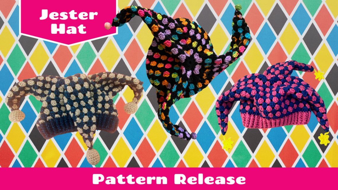 The Jester Hat is here — a no-sew, granny-square-style design that works up into the most delightfully chaotic hat with lots of options for ways to finish out the floppy bits!
